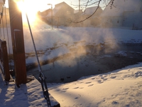 水温より気温が低い時に発生する自然現象で蒸気霧(じょうきぎり)と呼ばれるものだが、朝陽に照らされて実に神秘的だ ![]()