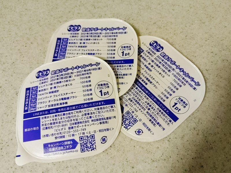 朝食で食べているビヒダスヨーグルトの蓋にキャンペーンのポイントが付いている。