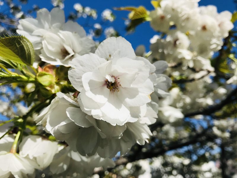 ソメイヨシノに替わって白い桜が満開を迎えている