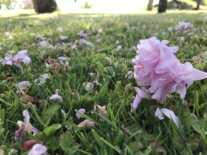 今朝の散歩で確認したところ、無残にも八重桜は散っていた