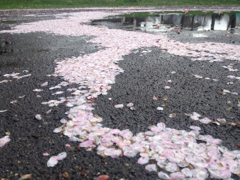 昨夜の雨でできた水たまりに浮かぶ桜の花びら。