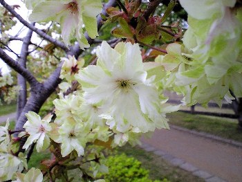 ネットで調べてみると、御衣黄(ぎょいこう)、鬱金(うこん)、黄桜(きざくら) という三種が花が緑色になるらしい。