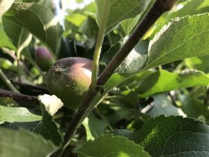 散歩コース途中のお宅のりんごの木に小さな実がなっていた