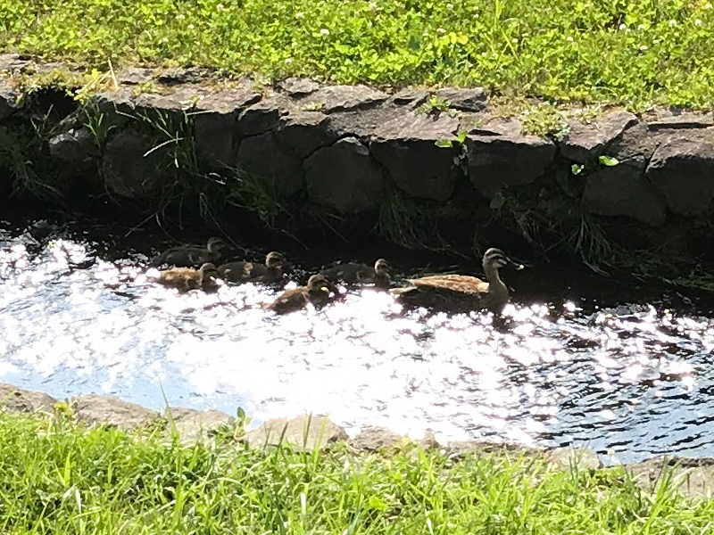 遊歩道を歩いていると、横を流れる小川にカモの親子の姿が