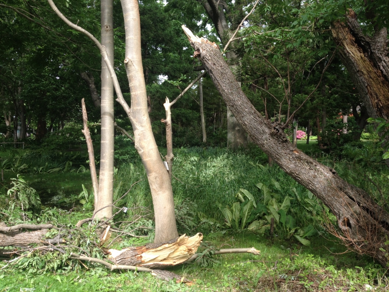今朝の散歩で公園を歩くと、週末の暴風雨の爪痕が残っていた。