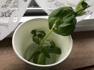 植え直さずに育てていたバジルで成長の悪いものを抜き、7月6日に購入したバジルを植え替え、摘芯した挿し穂を水耕栽培して根が出るのを待つことに。