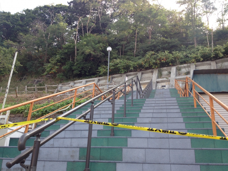 いよいよ山登りかと入り口の階段の前に行くと立ち入り規制のテープ ![]()