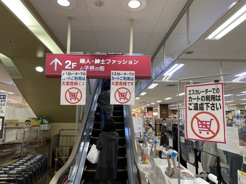 今日の午前中に買い物に行くと、エスカレーターの周りにベタベタと張り紙が