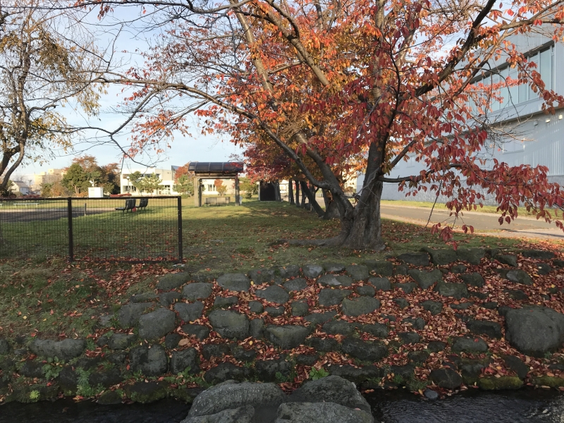 桜の葉が赤く色づき、小川の石積みに降り積もっていた。