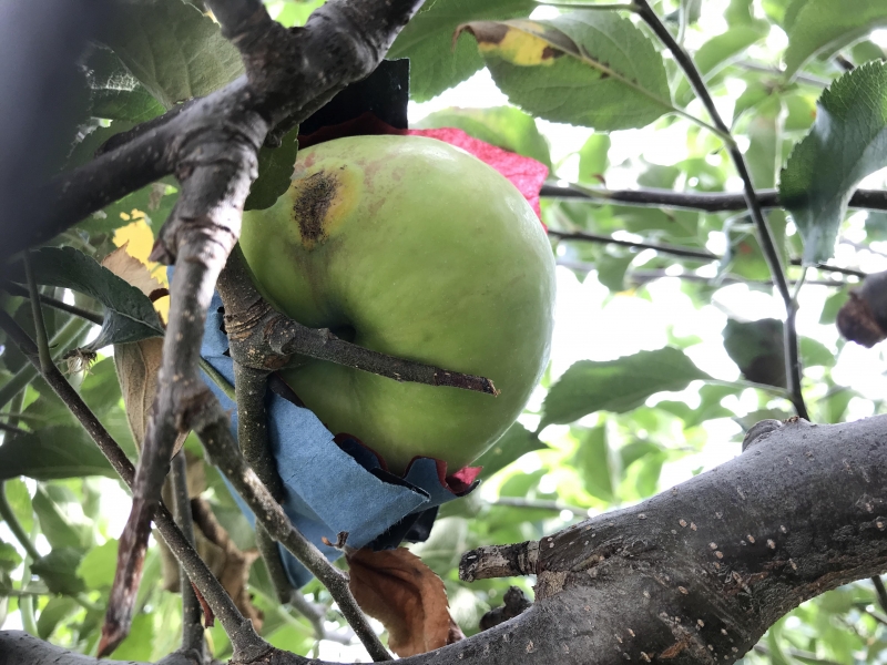 散歩コースの途中にあり、6月に袋をかぶせられていたリンゴが大きくなっていた